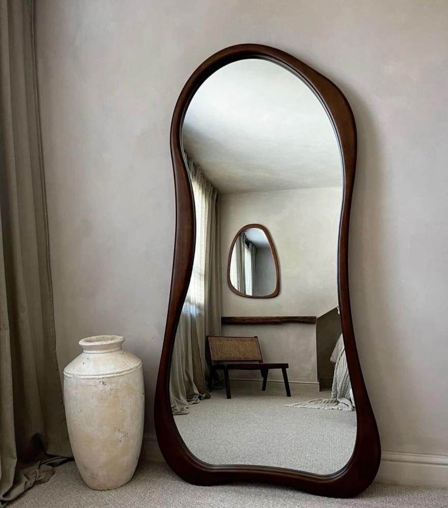 أضف لمسة من الفخامة العصرية إلى منزلك مع المرآة الأرضية الخشبية ذات التصميم العضوي المنحوت. تأتي هذه المرآة الكبيرة بإطار خشبي أنيق بلون بني داكن وخطوط منحنية غير تقليدية، لتجمع بين البساطة الطبيعية والأناقة الراقية.