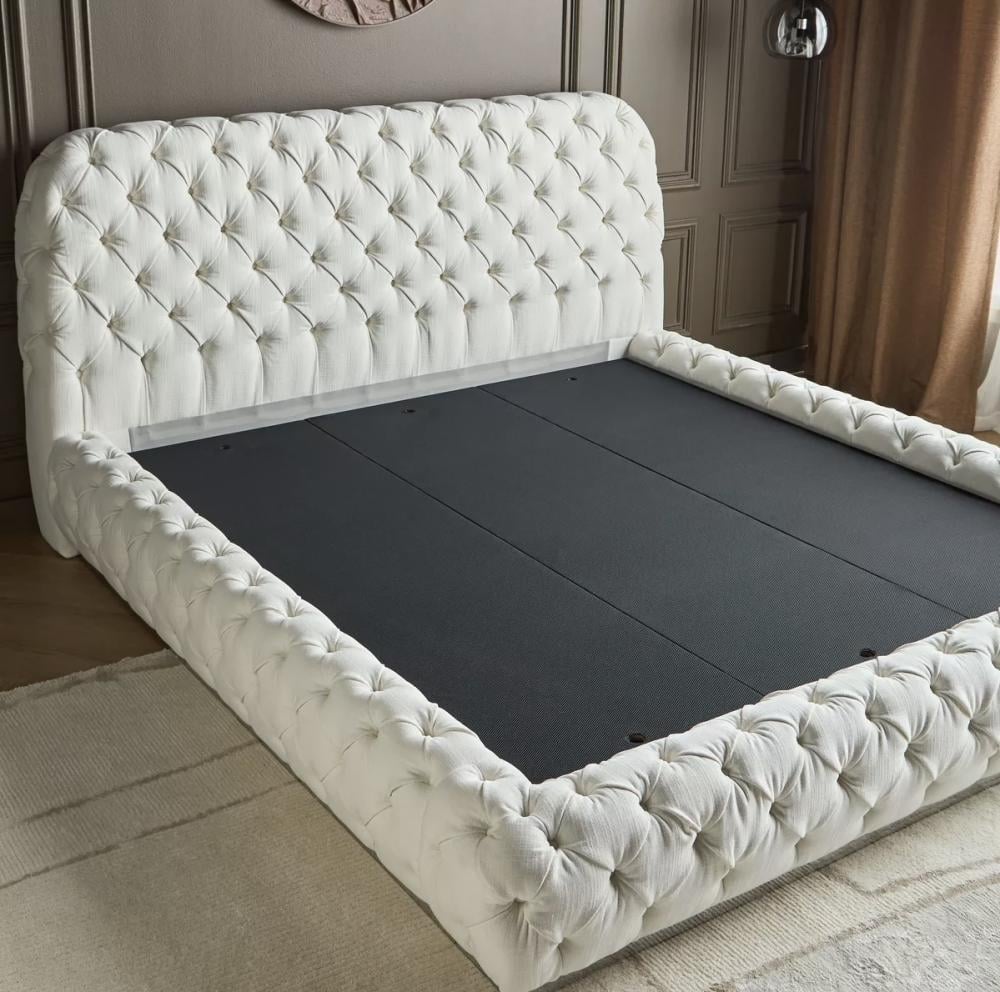 Fully upholstered in luxurious, soft-touch fabric, it features a solid wood frame for durability and a modern look, while the slatted frame ensures better sleep quality and extends the life of the mattress, making it the perfect addition to your room that enhances its overall aesthetic while providing you with luxury every night.